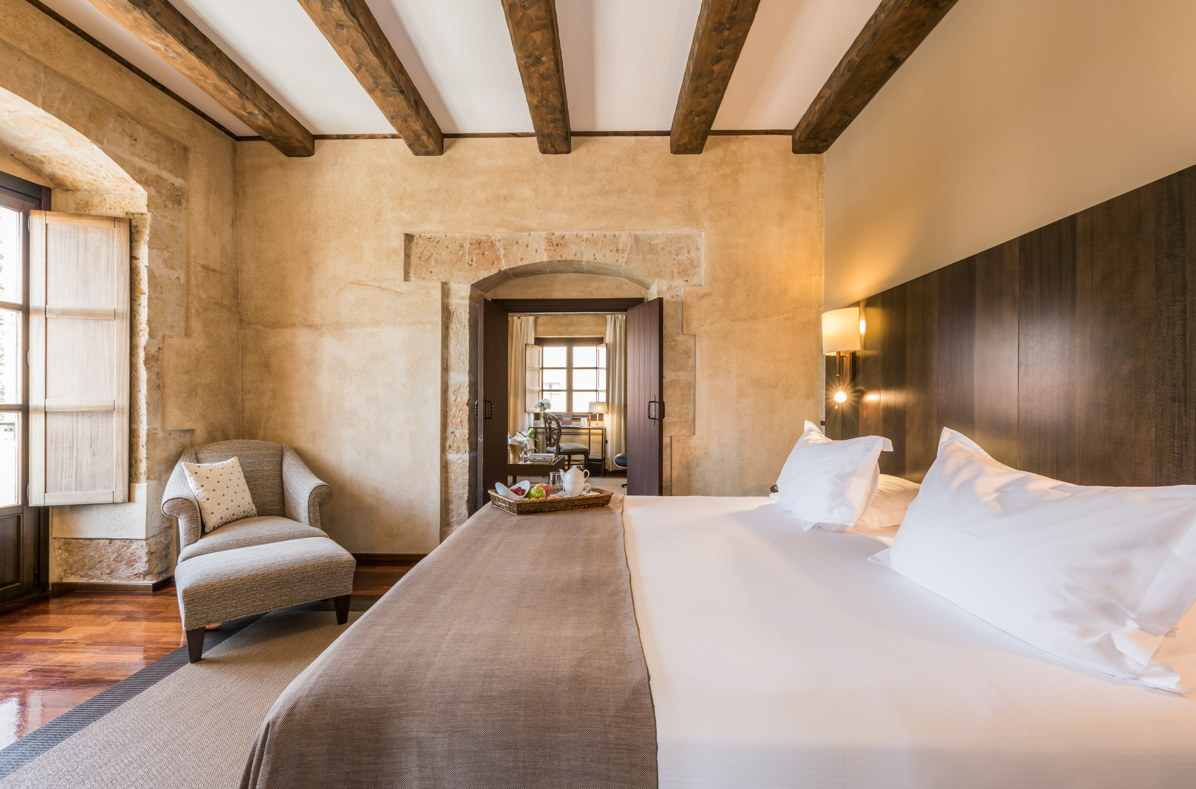 The hotel comprises 51 guest rooms, each of them an authentic tranquil haven between thick stone walls. Each room has WiFi and an en-suite bathroom and they all have views of the Cathedrals, the Patio de los Olivos or the romantic Cloister of the Convent of San Esteban.